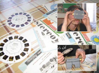 Oživením jednoho odpoledne byla vzpomínka na mechanické promítačky, o kterých by se dalo říct, že jsou předchůdci dnes známého 3D. Malé snímky (barevné nebo černobílé) jsou umístěny v tvrdém papírovém kotouči. Prohlížení se posouvá páčkou a prostorově vnímáte obrázky jako v realitě. Děj býval o městech, pohádky aj. Velkým hitem bývaly i malinké televizky s hanbatými obrázky. Zajisté ti dříve narození si vzpomenou a řeknou si, tak s tímhle jsme se bavili či hráli asi tak před 40 roky, možná i dříve. FOTO 26. 5. 2011 pravidelný čtvrtek