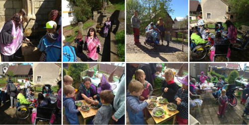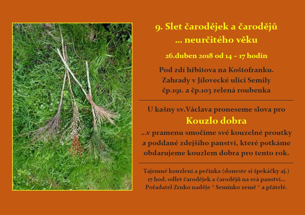 Dne 26.4.2018 v Jílovecké ulici pod zdí hřbitova na Koštofranku se sešli čarodějky a čarodějové neurčitého věku. U kašny sv.Václava byla pronesena slova pro KOUZLO DOBRA a smočili jsme v pramenu své kouzelné proutky. Poddané zdejšího panství, které jsme potkali jsme obdarovali kouzlem pro rok 2018. Pak už se na zahradě Zrnka naděje trošku čarovalo a opékali se dobrůtky. Počasí dnes bylo všelijaké, zamračeno s deštěm a pak sluníčko a pak zase déšť. A tak jsme se přesunuli do sídla (dům), kde jsme si pochutnali na buřtících, kávičce a pamlscích.